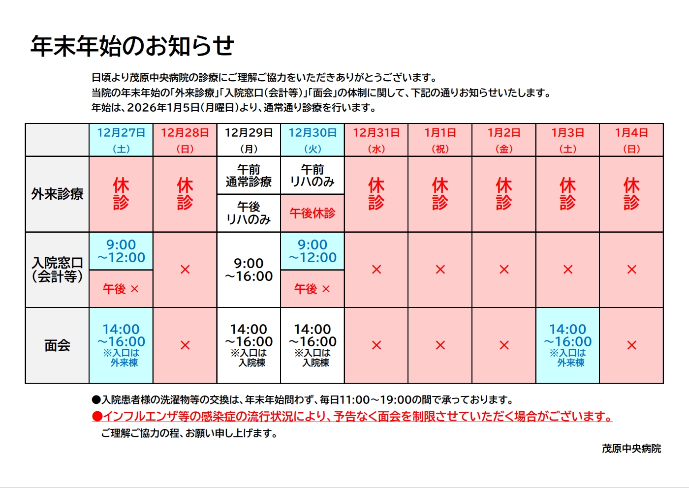 茂原地域の患者様が住み慣れた町で、長期療養さらに家庭復帰まで、質が高く、「感謝のこころ」で信頼ある医療を安心して受けられ、さらに、「愛し愛される」病院であり続けるために、職員一同とともに努力してまいります。今後とも茂原中央病院をどうぞよろしくお願いいたします。