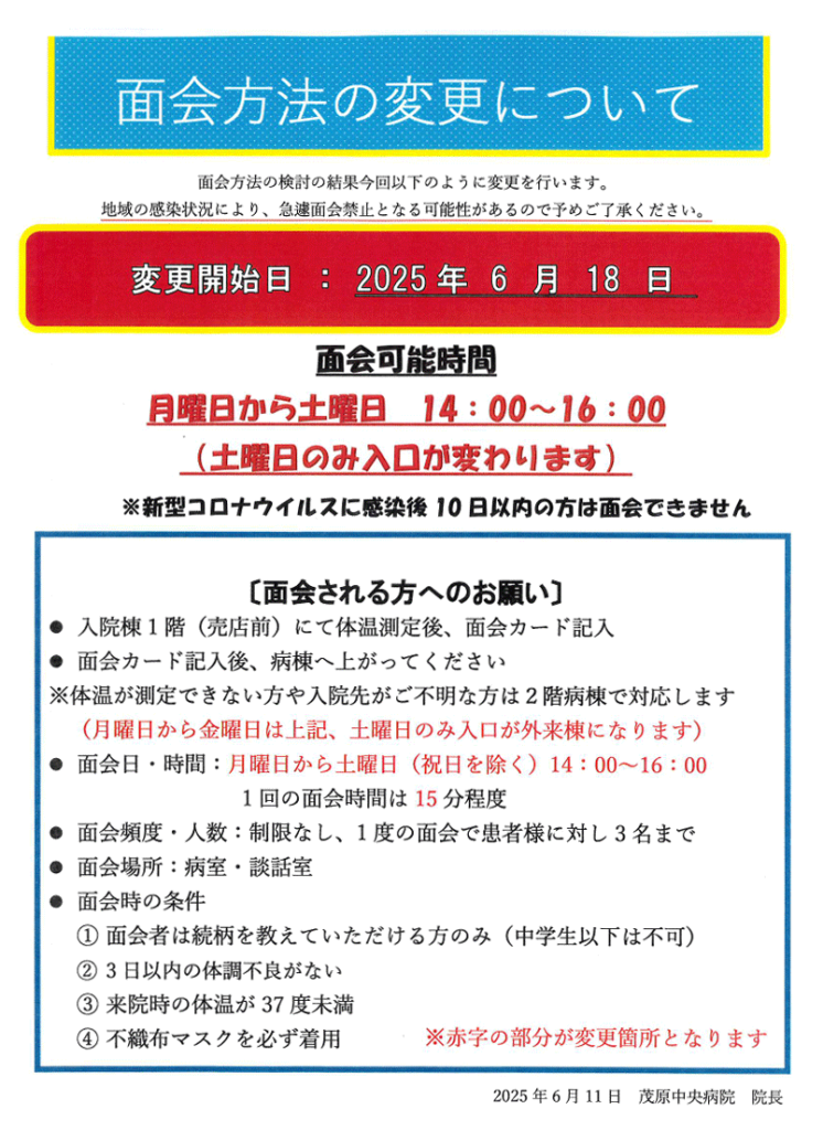 地域の感染状況により、急遽面会禁止となる可能性があること予めご了承ください。